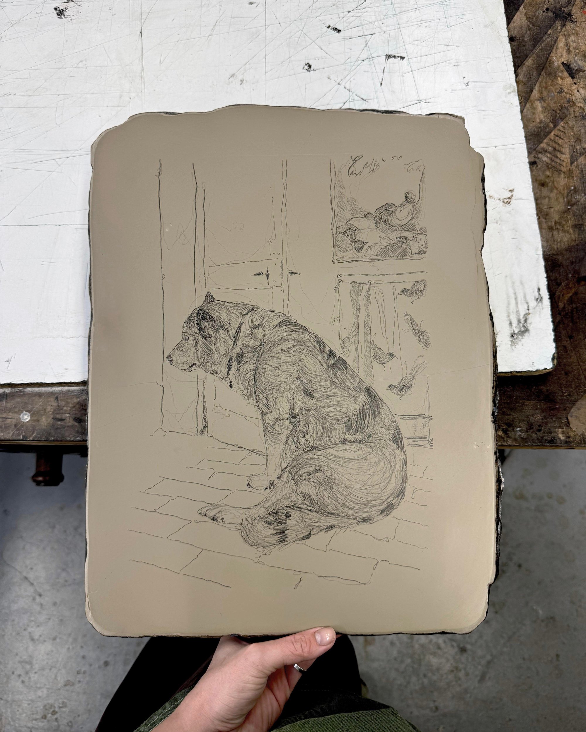 ‘Old Dog Dave’ is a limited edition stone lithograph print made during Georgia's time as artist in residence at the University of Lancashire in 2026. The edition is inspired by Georgia's big rescue dog Dave, a handsome and rather melancholy Malamute, Husky, German Shepard crossbreed.