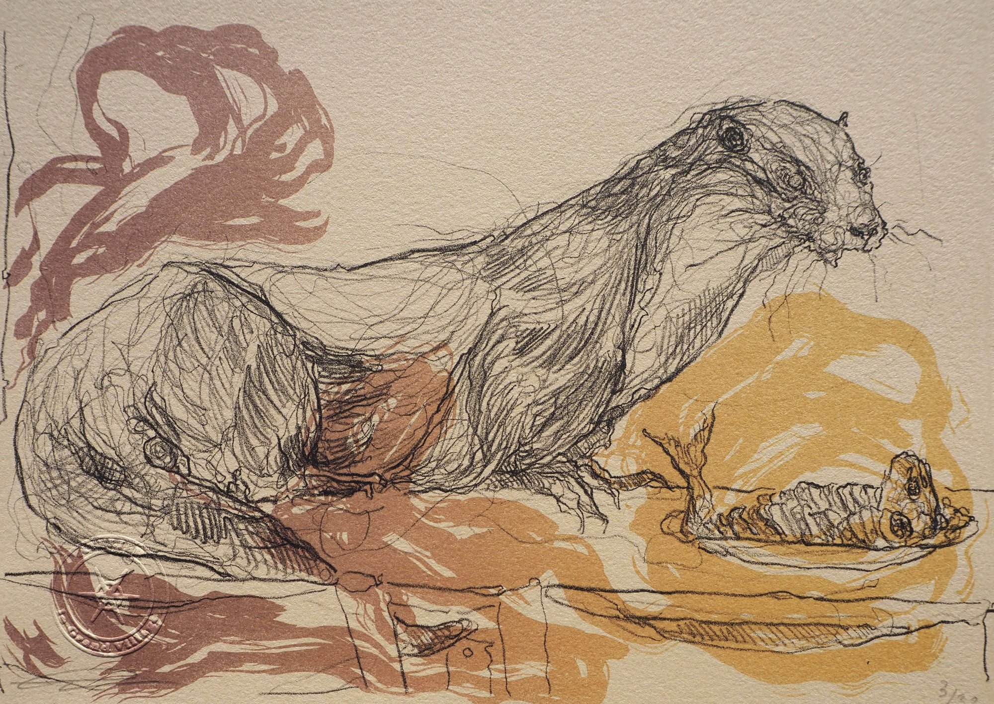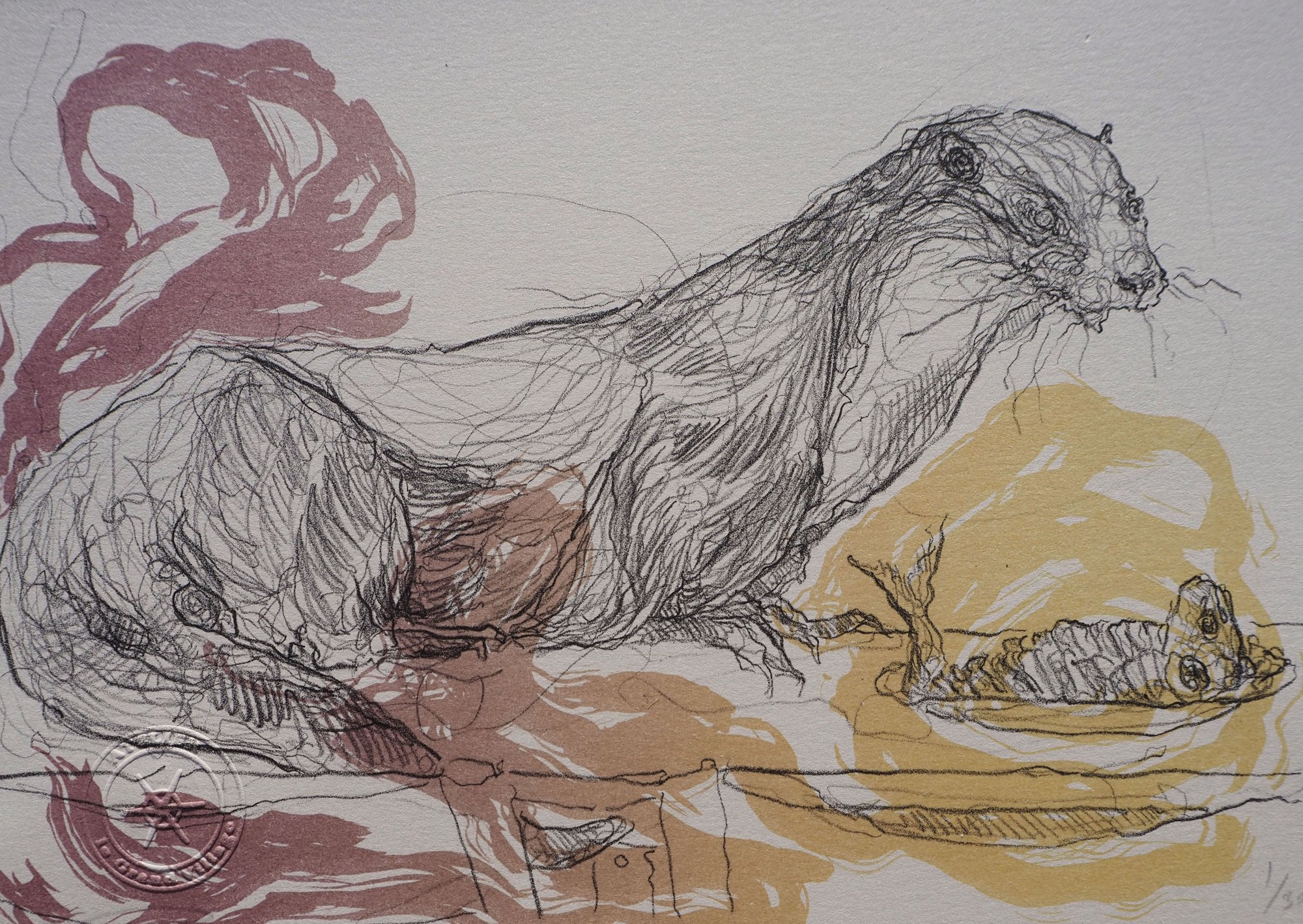 ‘Otter’ is a two-colour stone lithograph edition of 30 prints, produced in 2025 by Georgia Green and Atelier le Grand Village. There are three paper variations available. Tan (pictured 2nd), Grey (pictured 4rd) and White (pictured 5th).